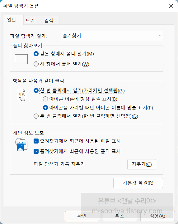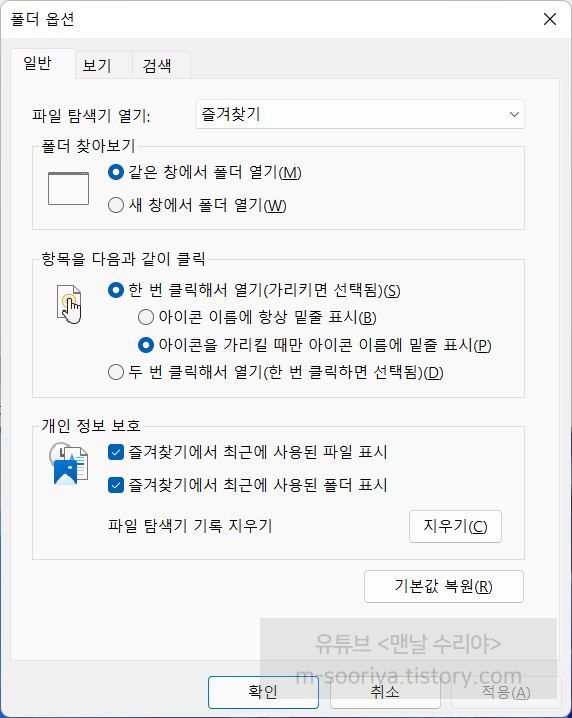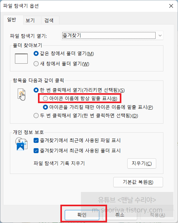 이제 [일반]탭에서 [한 번 클릭해서 열기]를 선택 후 [확인]을 누릅니다.