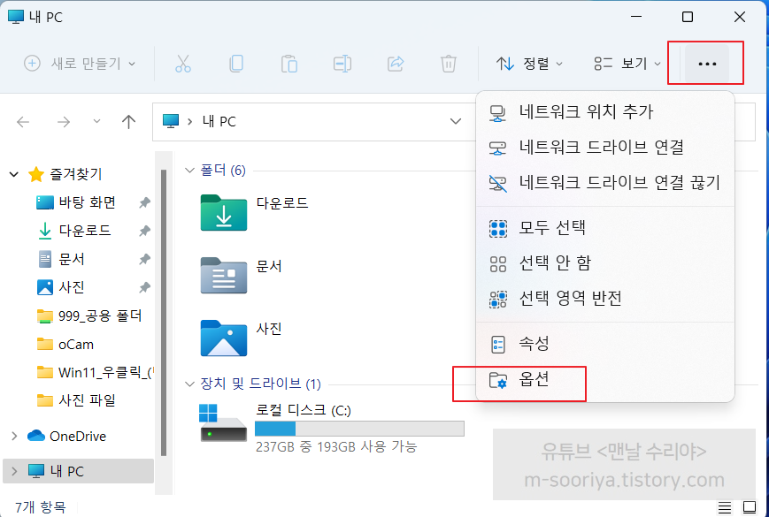 먼저, 아무 폴더나 윈도우 탐색기를 실행 후, 우측 3개의점 클릭 후 [옵션]을 클릭합니다.
