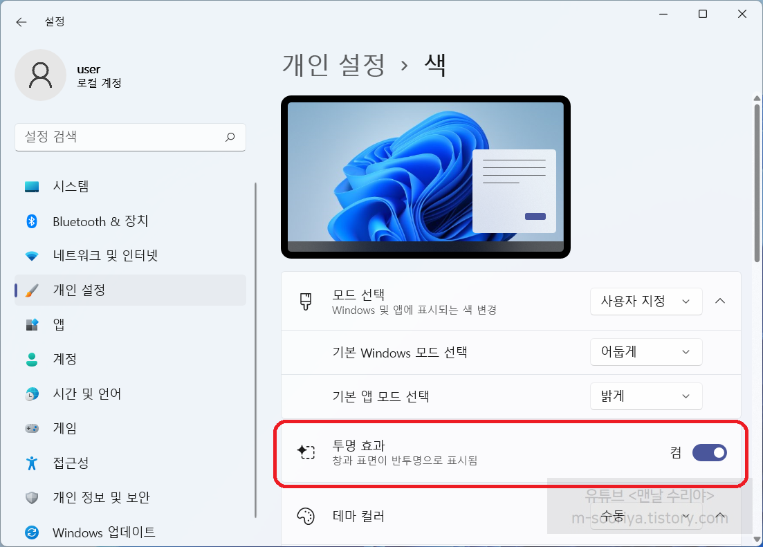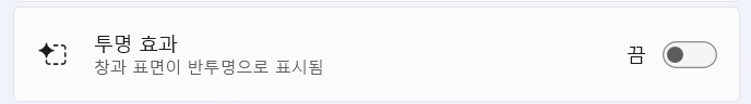 6) 그런데 [투명 효과]가 [켬]상태라면 검은색이 진하지 않고 불투명하며, 윈도우창이 겹쳐져 지저분해보일 수 있습니다.
