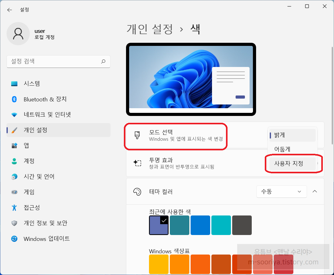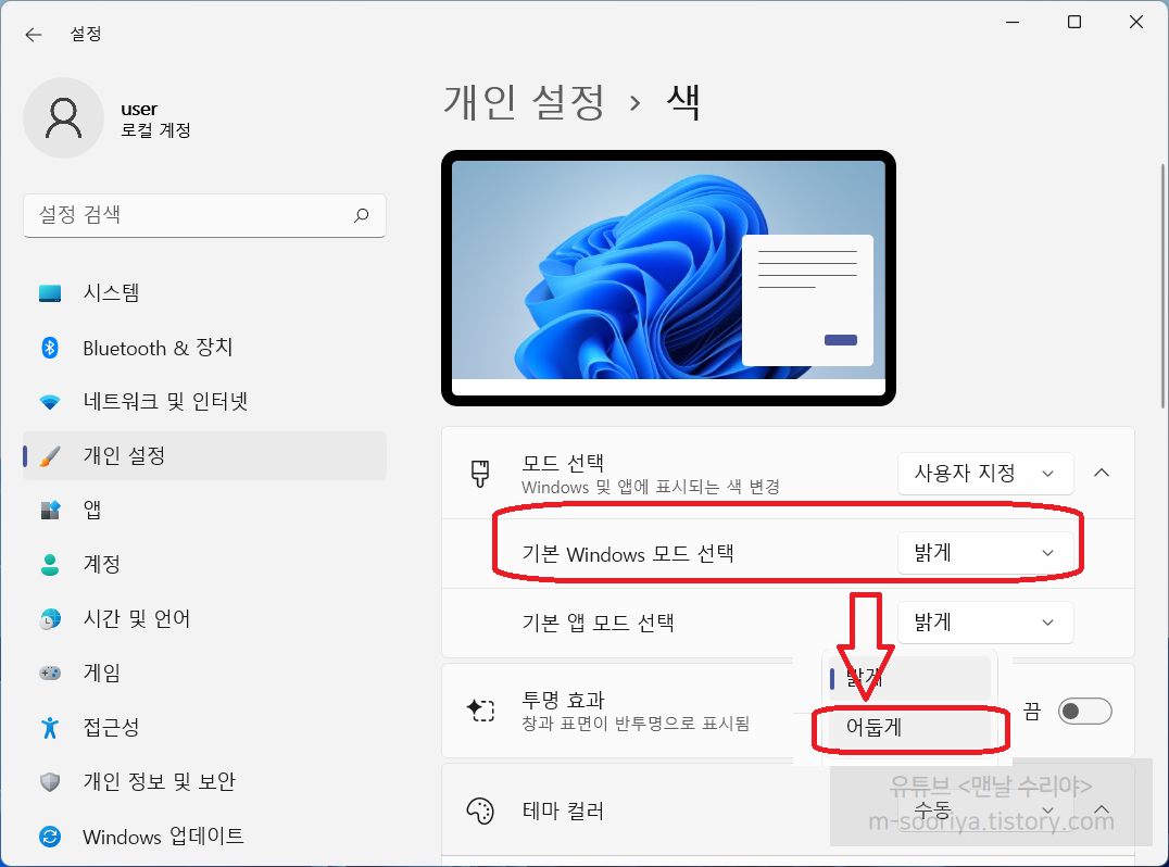 4) 이제, 기본 Windows 모드 선택도 [어둡게]로 바꿔줍니다.