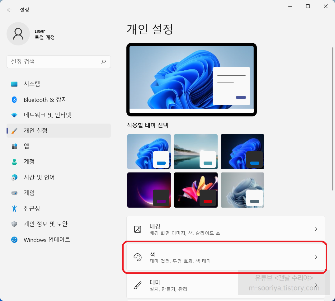 2) 그다음 좌측의 [개인 설정]을 누른 뒤, 우측의 [색] 메뉴를 누릅니다.