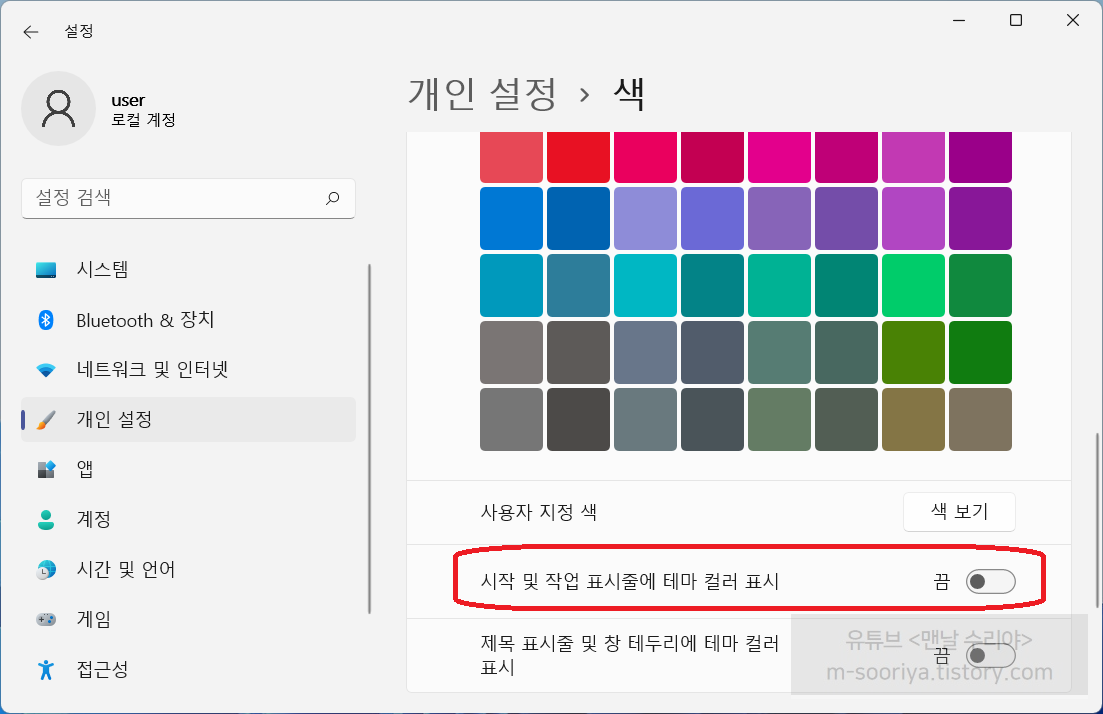 (사실 작업 표시줄 색상을 따로 설정하는게 아니라, 이렇게 2가지 밖에 선택하지 못한다는게 아쉽긴 합니다)