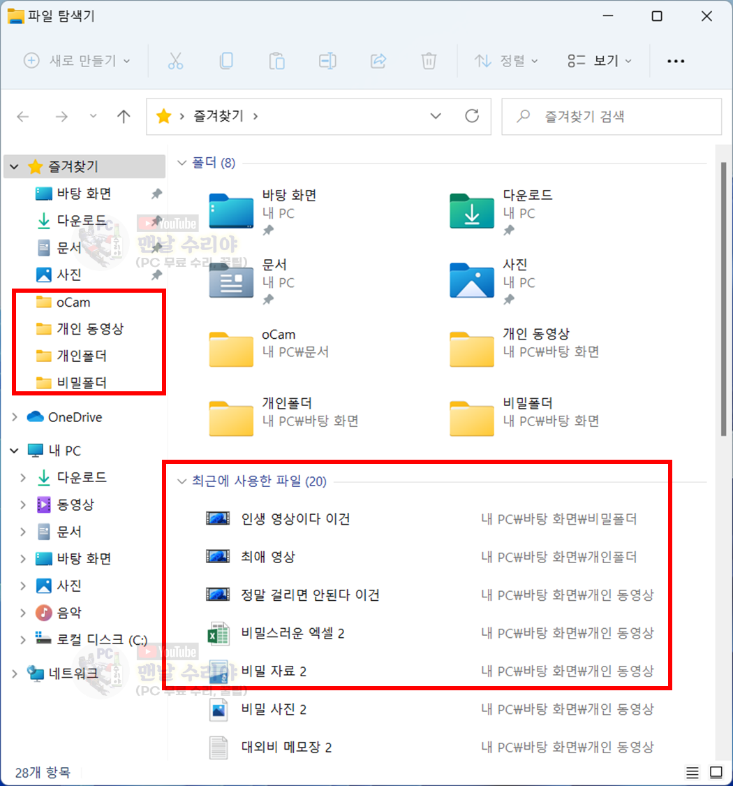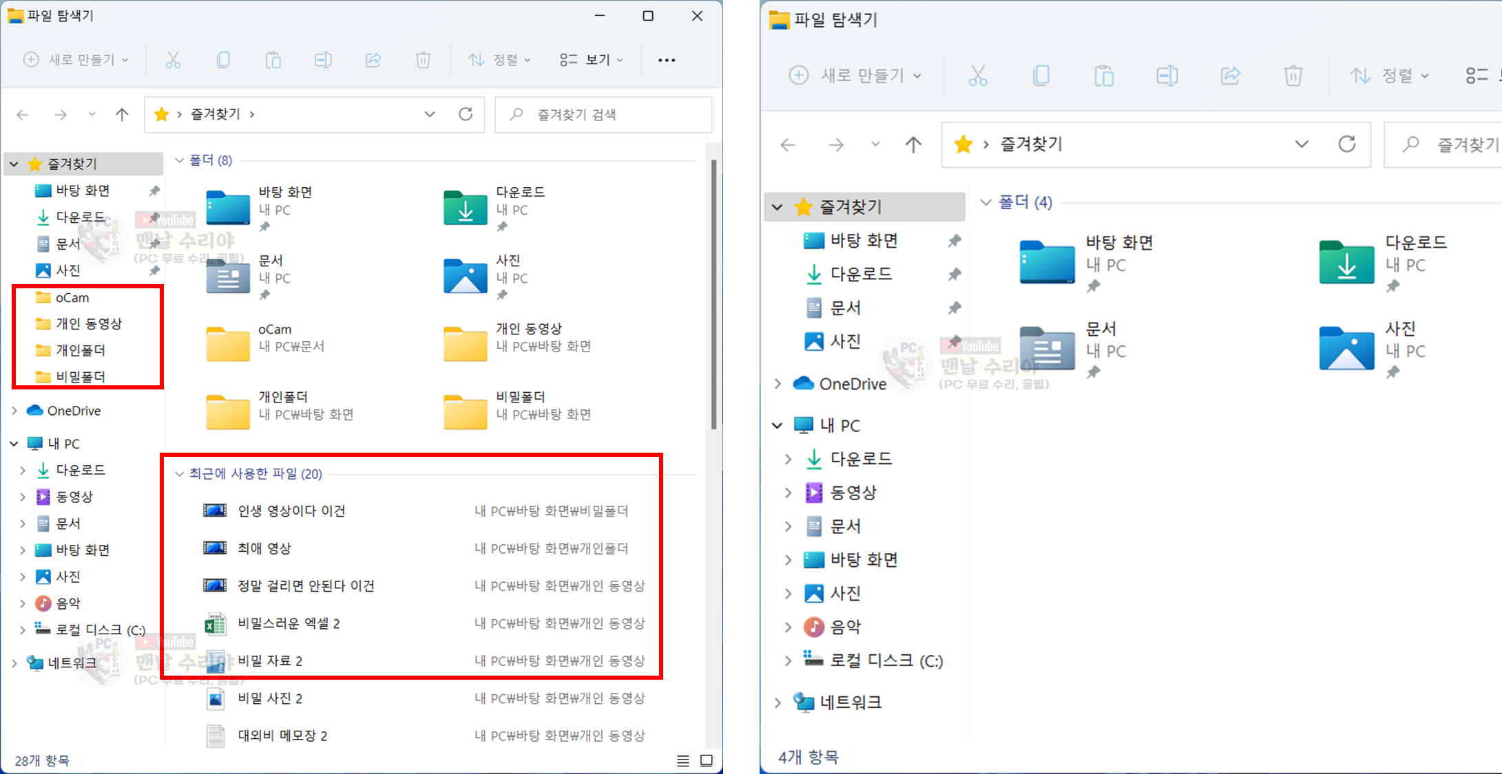 윈도우 탐색기를 실행하면 좌측에는 최근에 실행한 폴더가 있고, 아래쪽에는 최근 실행 파일이 나타납니다.