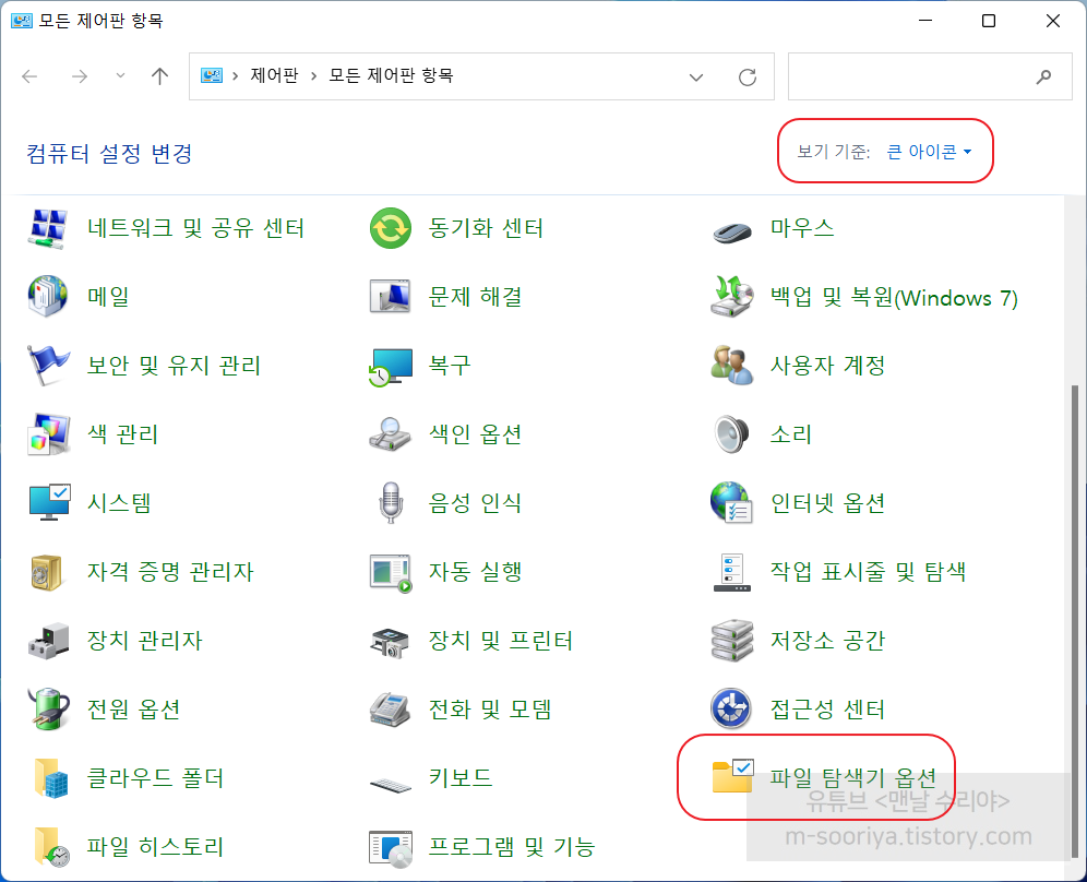 2) 그다음 [보기 기준 : 큰 아이콘]으로 변경 후 [파일 탐색기 옵션]을 클릭합니다.