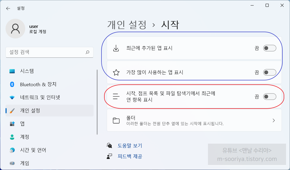 3) 자 이제 마지막으로 아래 항목에 대해 [끔]으로 바꿔줍니다.