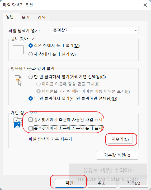 3) 그다음 [일반]탭에서 [지우기]를 먼저 누른 뒤 아래 2가지 항목의 체크를 해제하고 [확인]을 누릅니다.