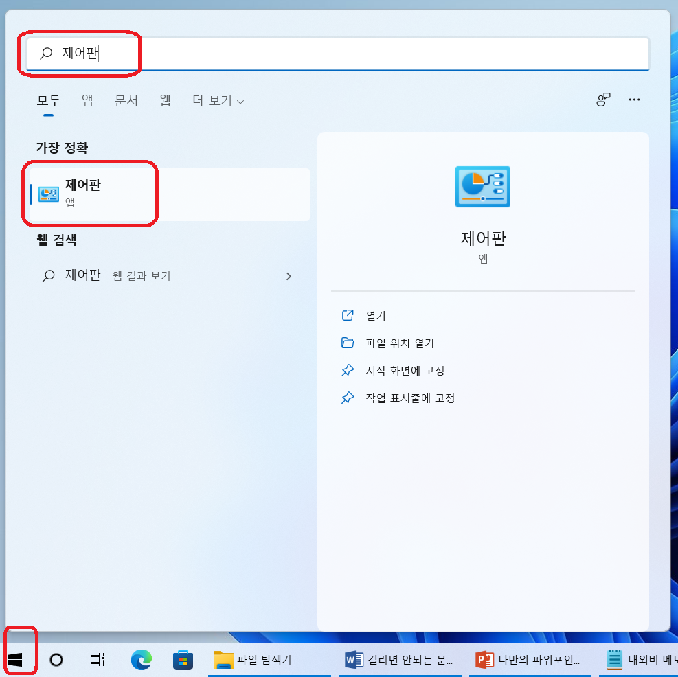 1) 먼저 윈도우 시작버튼을 누르고 [제어판]을 검색 후 실행합니다.