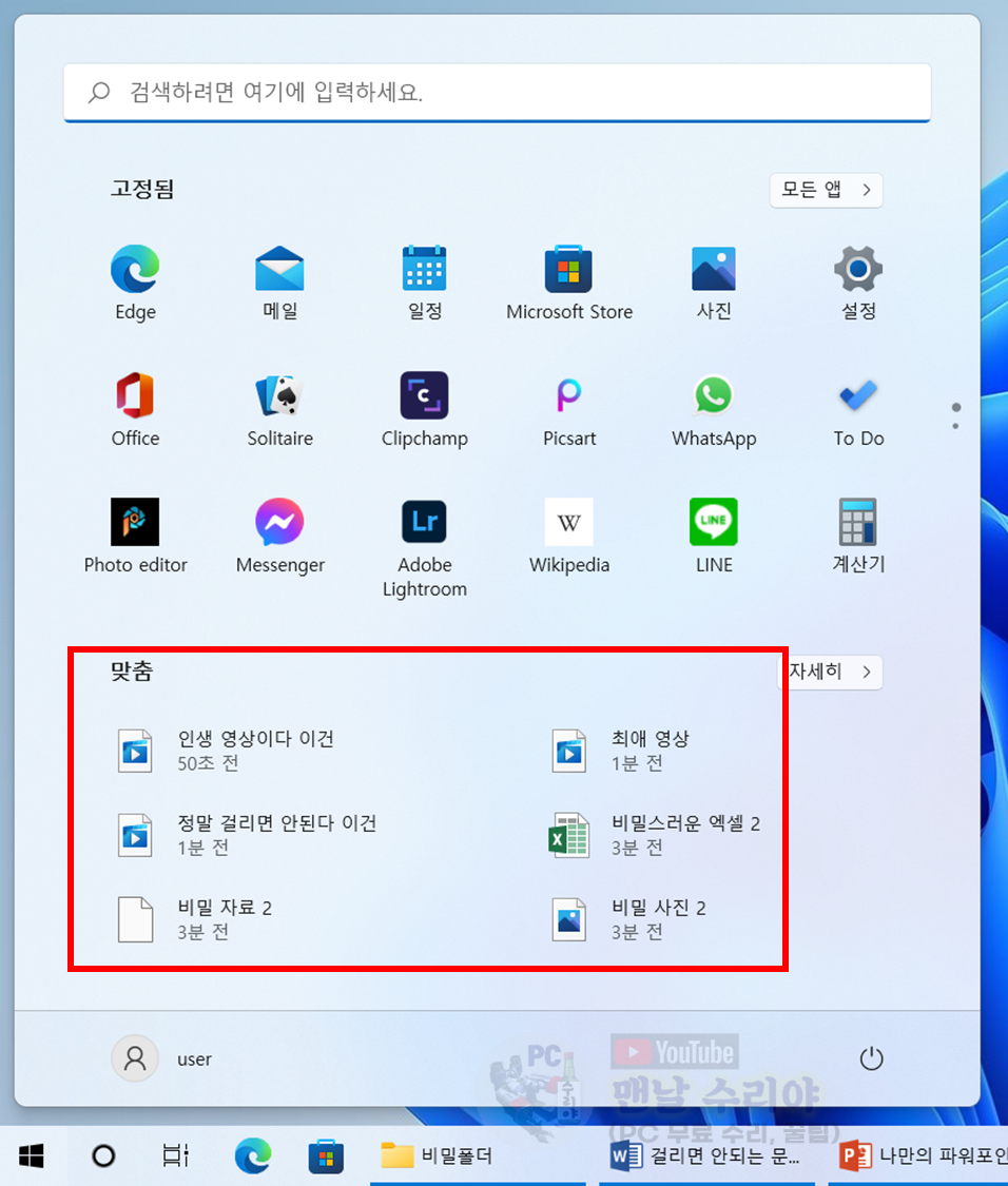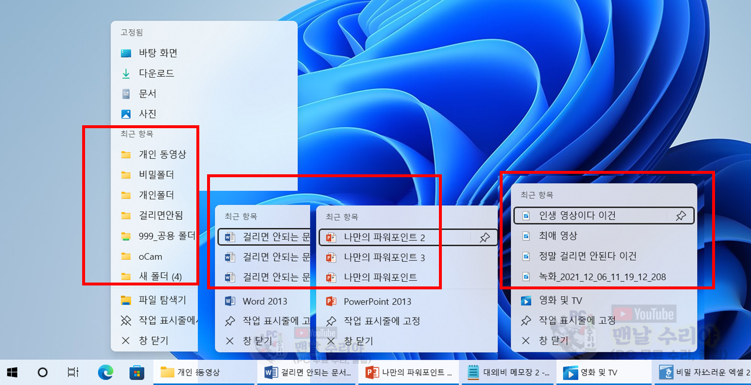 윈도우 시작버튼을 누르면 바로 나타나는... 최근에 실행한 파일들..