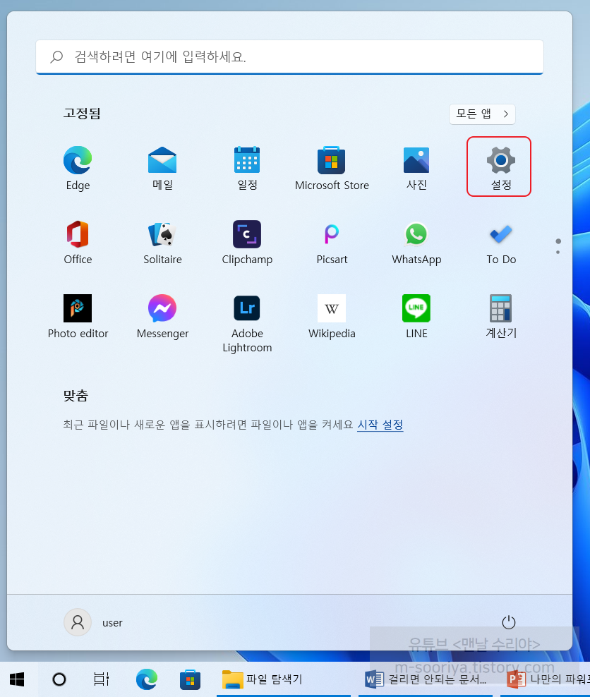 1) 먼저 윈도우 시작버튼을 누르고 [설정]앱을 실행합니다.