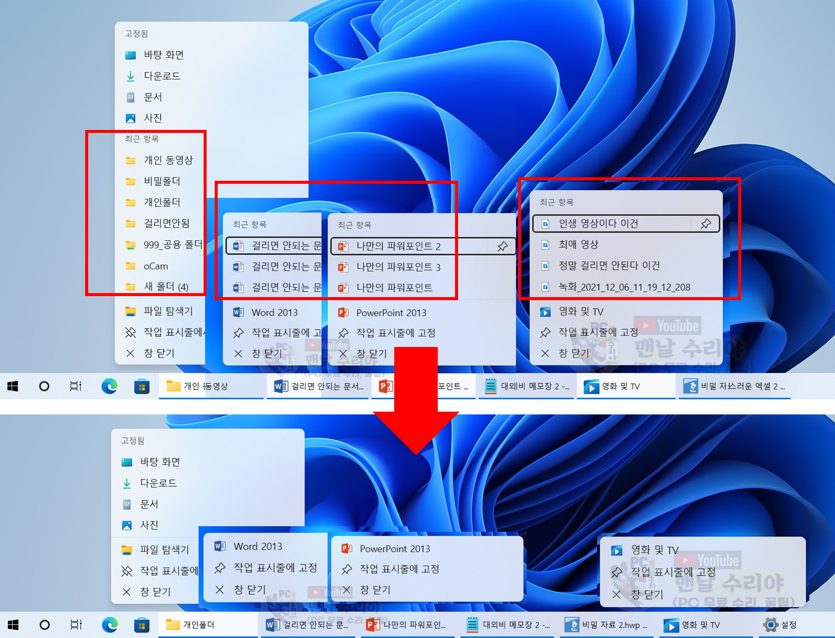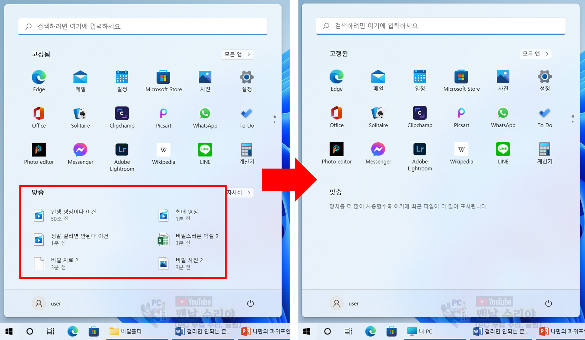 그럼 이제 시작버튼과 작업표시줄에서 최근 실행 파일 목록이 사라집니다.