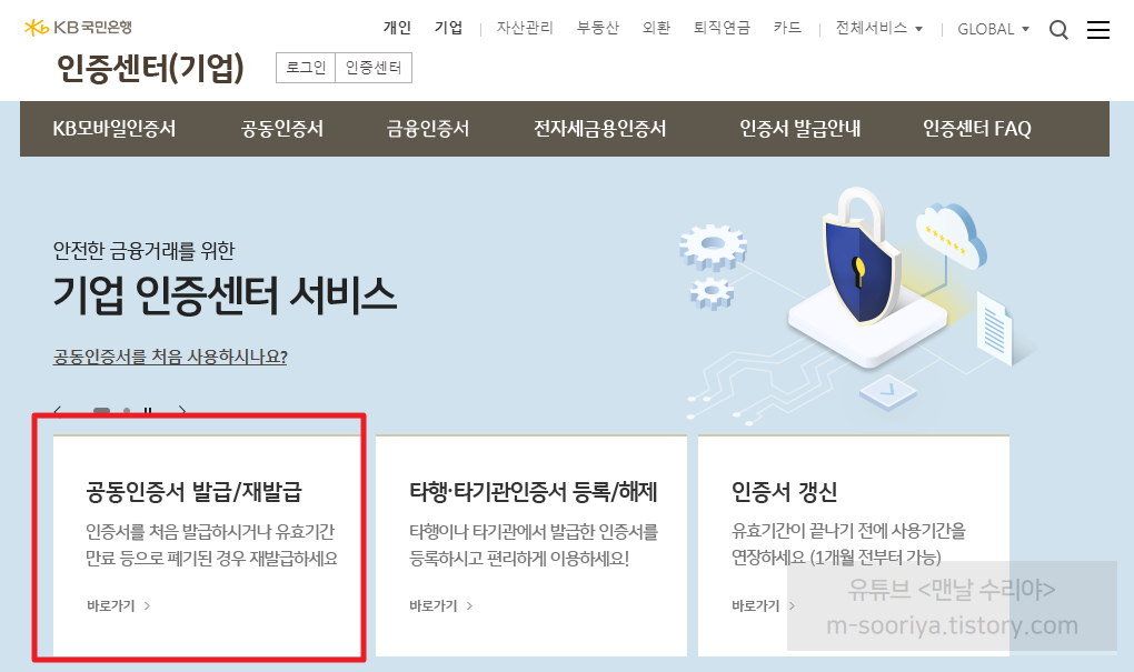 2) 그 다음 좌측 상단의 [인증센터]를 클릭하고 [기업]을 클릭합니다.
