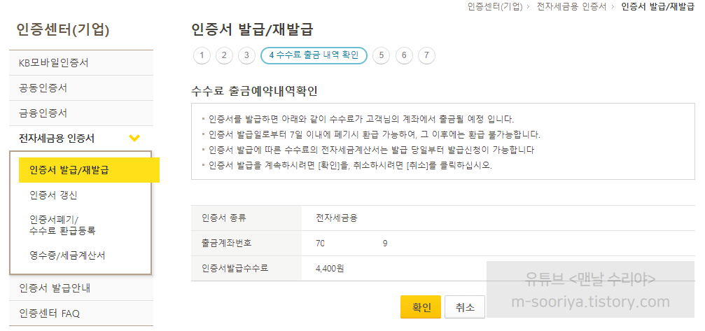 4) 그 다음, 좌측의 [금융인증서]를 클릭하고 [인증서 발급/재발급]을 클릭한 다음 우측의 모든 정보를 기입합니다.