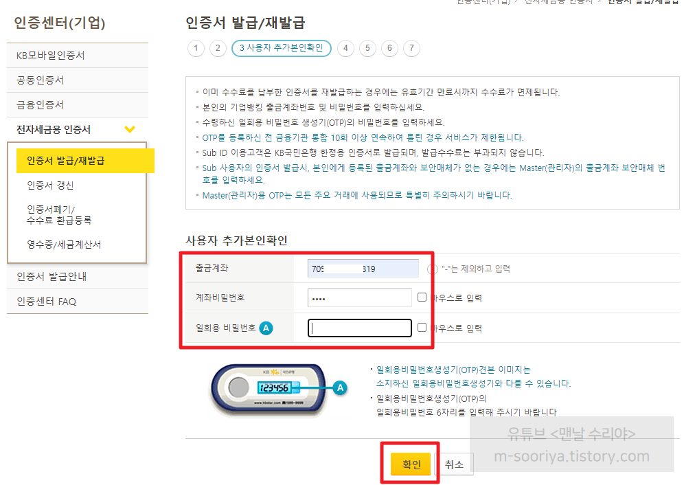 7) 이제 아래 정보를 모두 입력하고, 일회용 비밀번호 생성기의 6자리를 넣고 [확인]을 누릅니다.