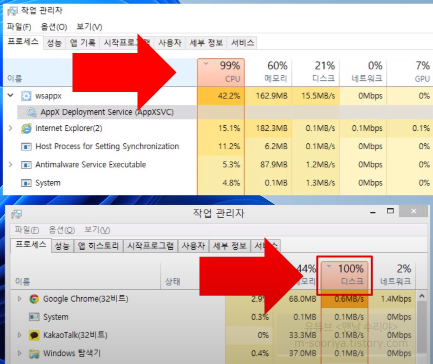 ▶ 디스크 100% 문제 해결법 : https://m-sooriya.tistory.com/261