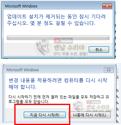 5) Internet Explorer 11이 제거되면 [지금 다시 시작] 클릭