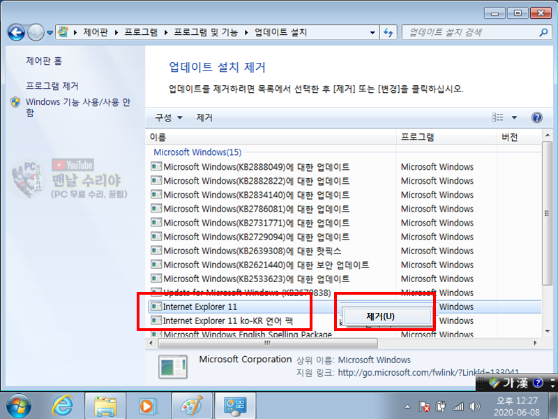 이렇게 해서, 윈도우7에 설치된 익스플로러 11 을 삭제하는 방법을 알아보았다.
