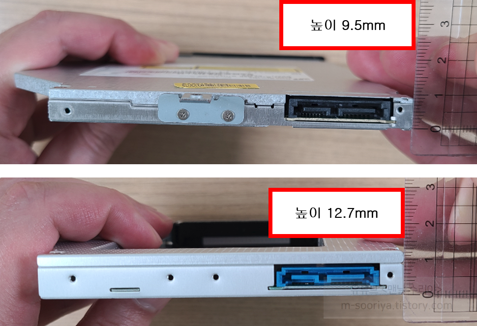 ODD 높이는 두 종류(9.5mm, 12.7mm)가 있는데, 높이가 맞지 않으면 두꺼워서 들어가지 않거나 너무 헐렁하게 됩니다.