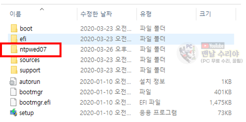 윈도우 설치 USB를 만들었다면, ntpwed07 폴더를 같이 넣어주면 된다. (아래 사진 참고)