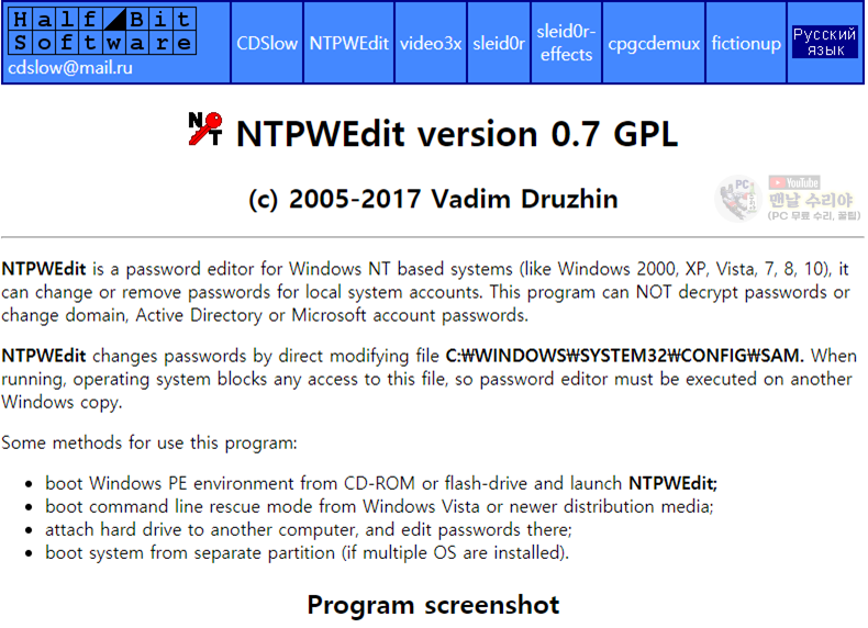 이번시간에는 윈도우10 로그인 암호를 찾는 프로그램을 소개하겠다. 지난시간에는 이 프로그램을 이용하여, PC에서 실제로 사용하는 방법을 알아봤으나, 이 프로그램을 다운받는 방법도 짧지는 않아서 별도로 빼놓았다. 가끔씩 윈도우10에서 로그인 암호가 기억이 안나는 경우가 있는데, 기존 비밀번호를 찾는 방법은 없다. 다만, 이 프로그램을 이용해 다른 패스워드로 변경하는 수 밖에는 없다.