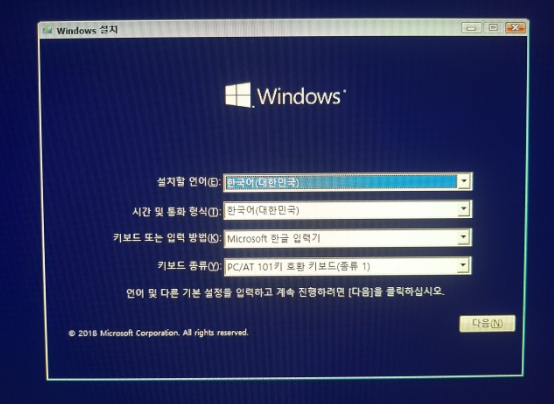 USB를 PC에 꽂은채 부팅하면, 아래와 같이 윈도우10 설치화면이 나타날 것이다.