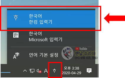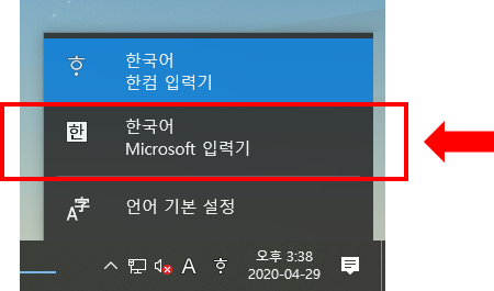 : 작업표시줄 우측 하단 -> ㅎ 아이콘 클릭 -> 한국어 (한컴 입력기) -> 한국어 (Microsoft 입력기) 클릭