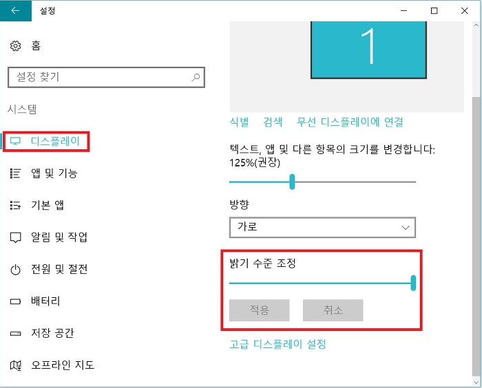 노트북은 아래와 같이 [설정]에서 [밝기]를 조절하거나 단축키를 통해 간편하게 조작할 수 있습니다.