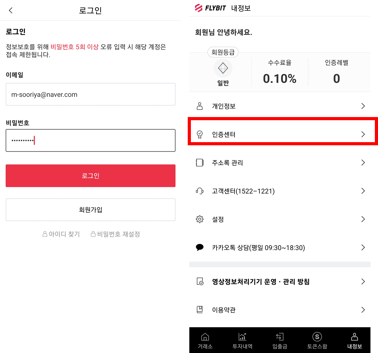 다시 플라이빗 앱에서 로그인하고 [인증센터]를 누릅니다.