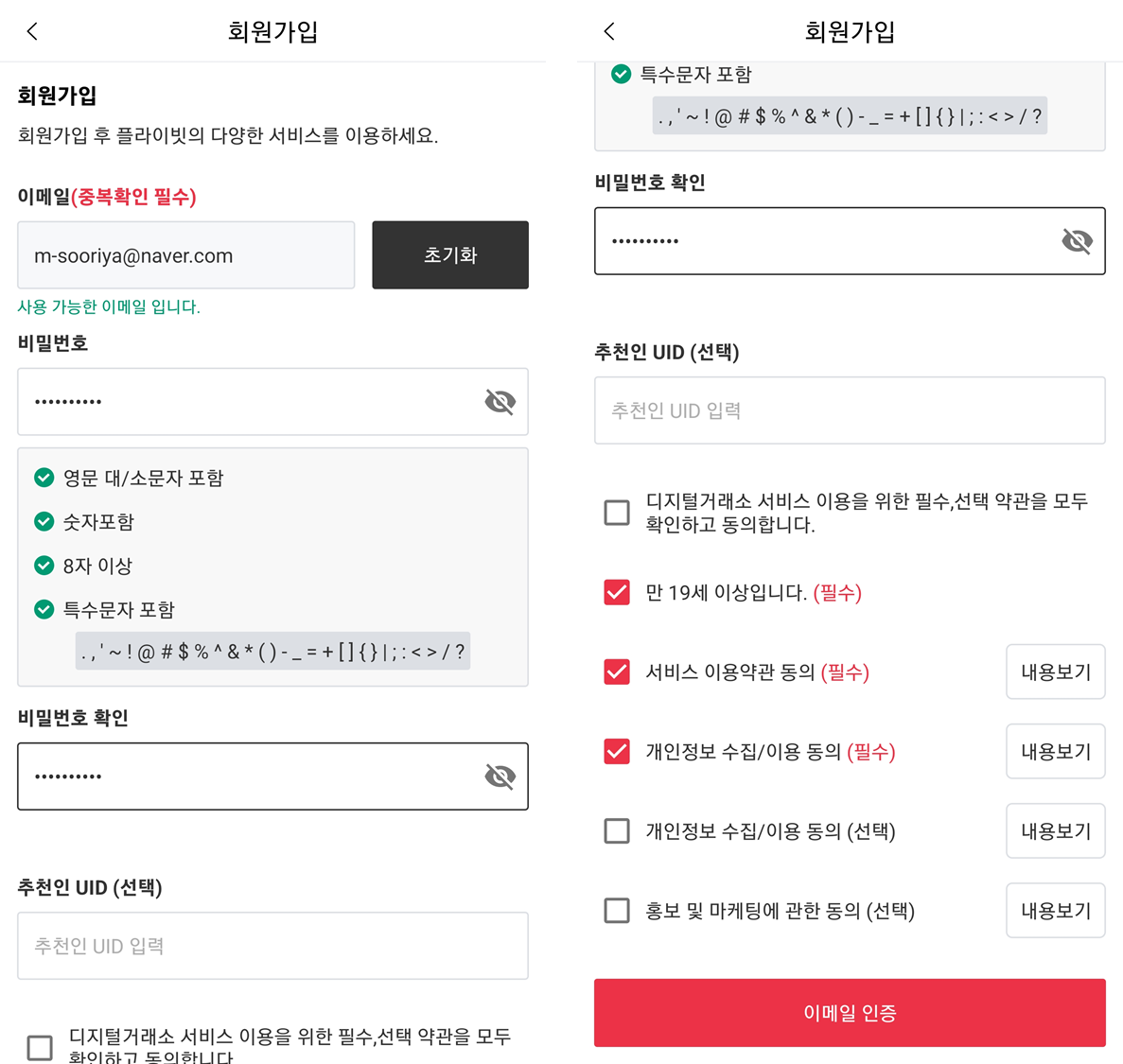 4) 이메일 주소와 비밀번호를 입력하고 약관에 동의합니다