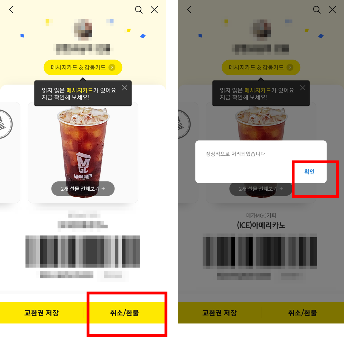 2) 받은 선물중에 하나를 터치하면 [취소/환불] 버튼이 있을겁니다.