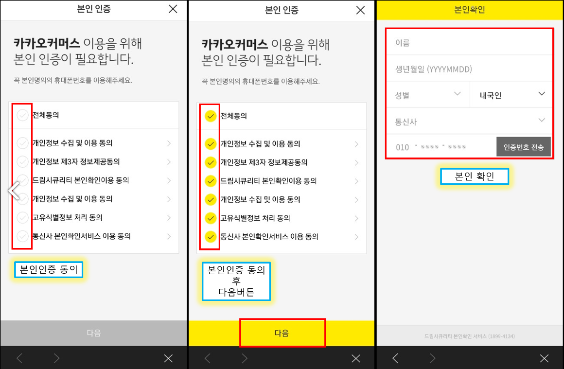 4) 만약 [취소/환불]을 처음으로 진행한다면 아래와 같이 카카오 커머스 본인인증이 필요할텐데 간단히 진행해주세요