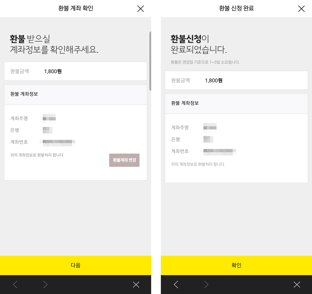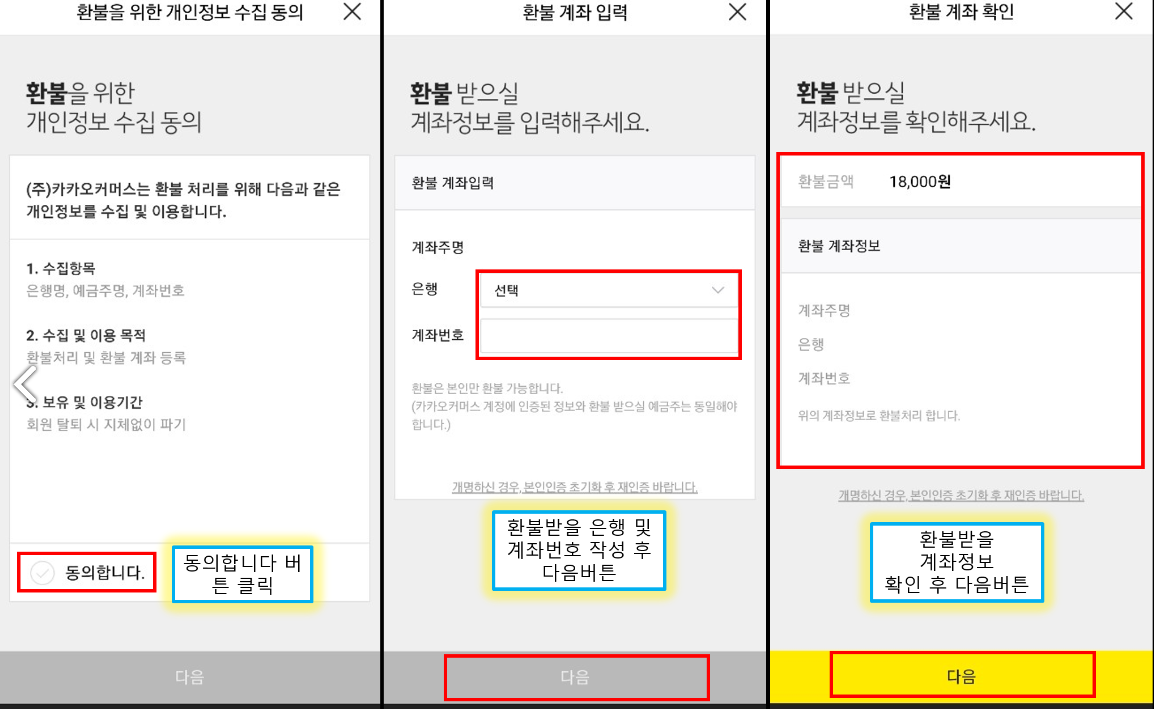 6) 이제 환불받을 계좌정보를 확인하고 [다음]을 클릭하며 [확인]을 눌러 마칩니다