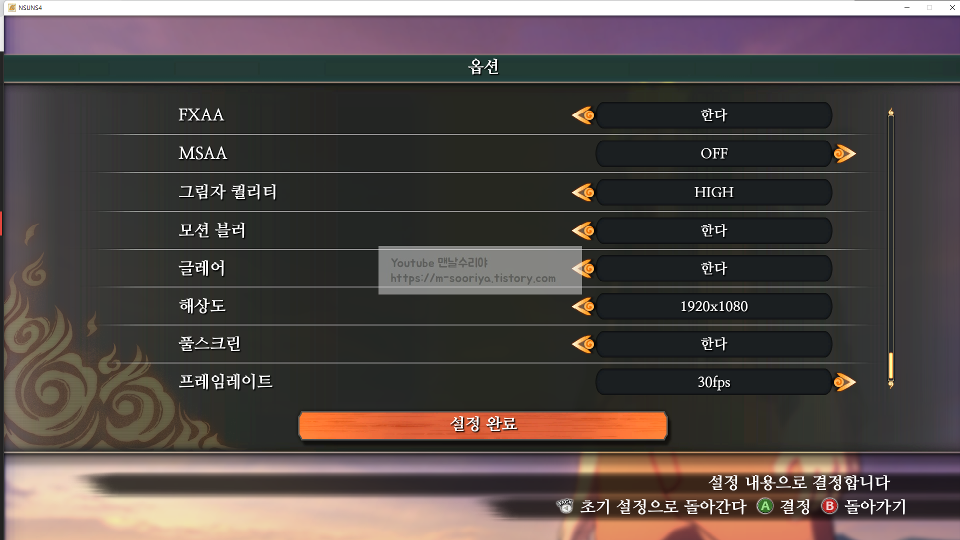 여기서 [풀스크린]을 [한다]로 바꾼 다음 [설정 완료]를 누르면 됩니다.